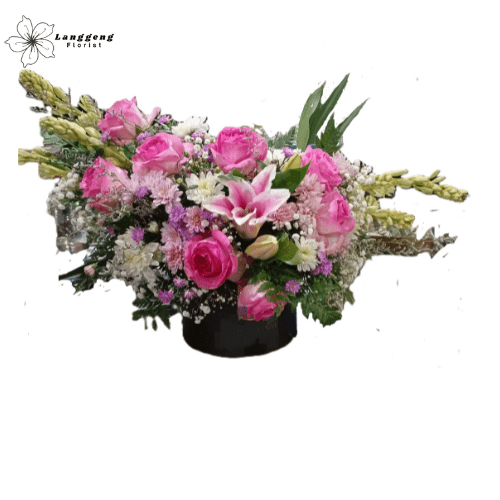 engan model horizontal, BX_02 tampil unik dan manis. Dominasi bunga mawar pink terang yang dibalut dedaunan hijau memberi kesan ceria dan penuh semangat. Rangkaian ini cocok untuk hadiah sahabat, momen wisuda, atau sekadar ucapan semangat.